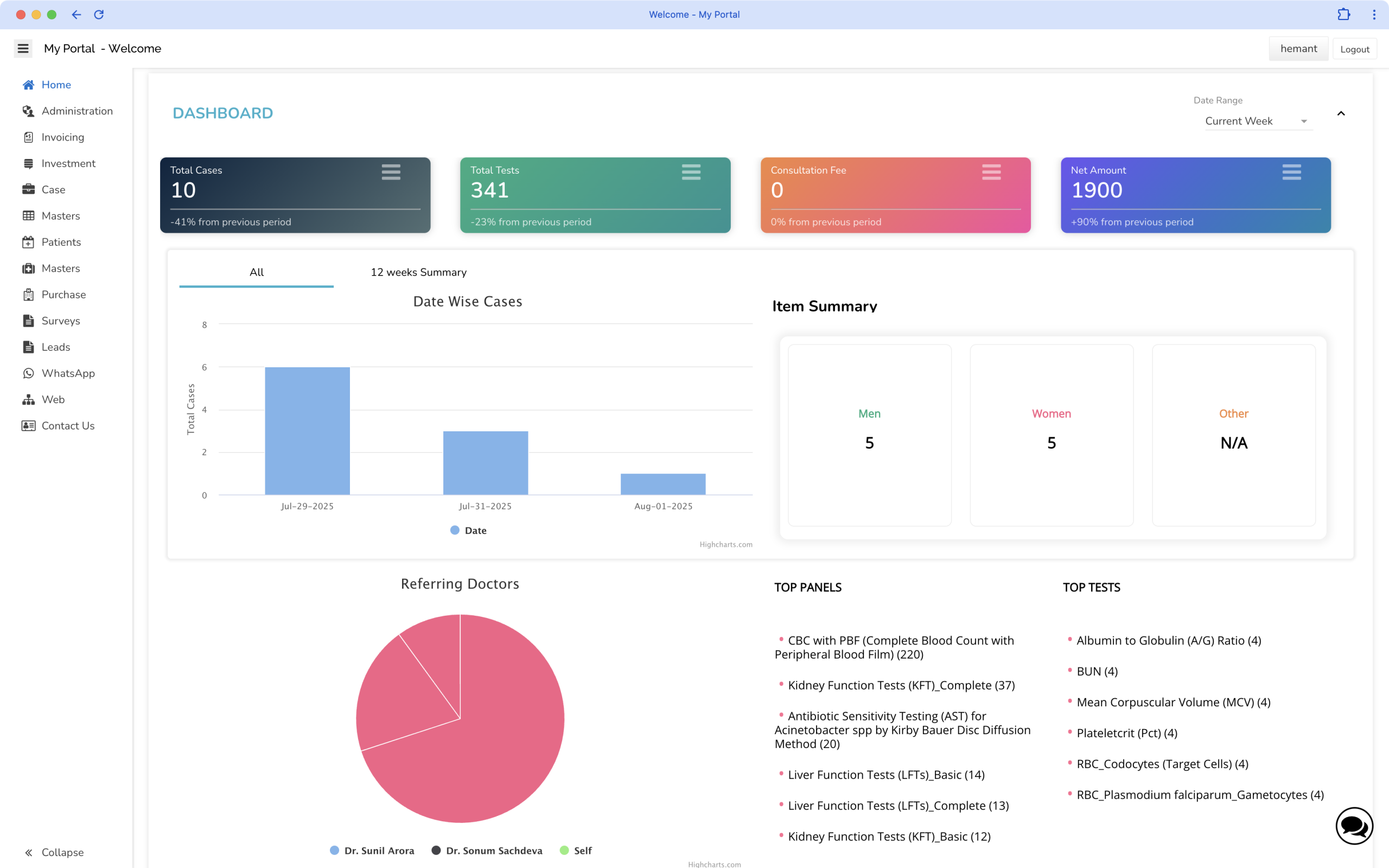 Get real-time insights into patient volume, turnaround time (TAT), pending tests, staff performance, and revenue.